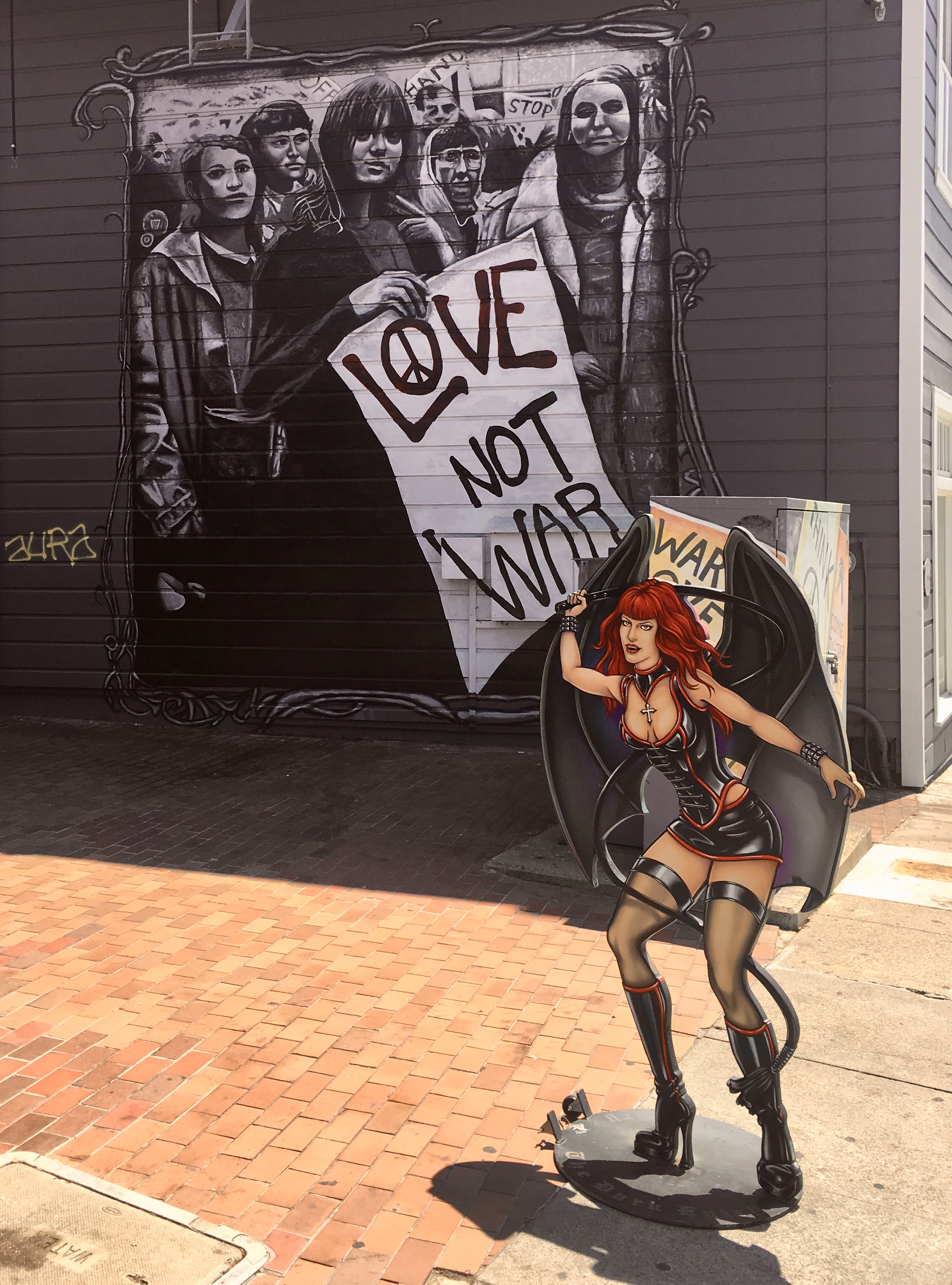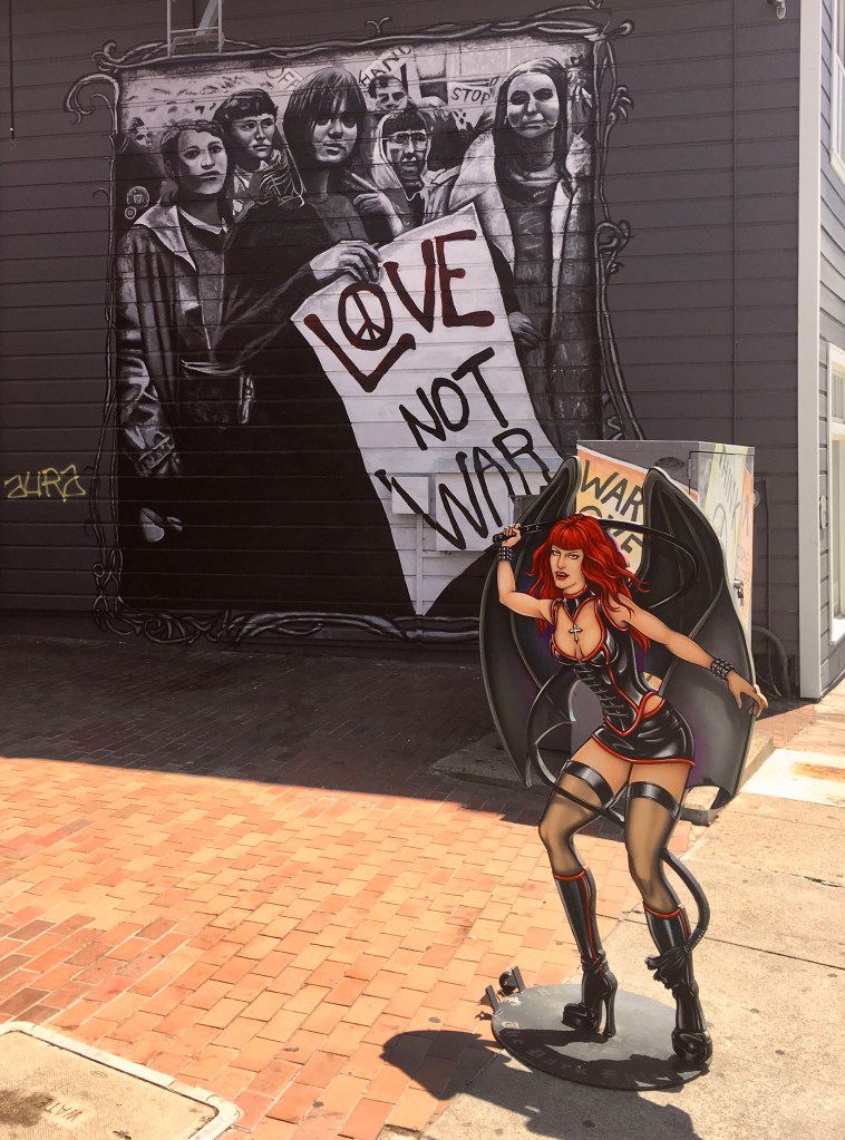 fullsizeoutput_10fa Published August 15, 2017 at 2444 × 3300 in Signs and Street Art Love not war next to a shop selling bondage knick-nacks