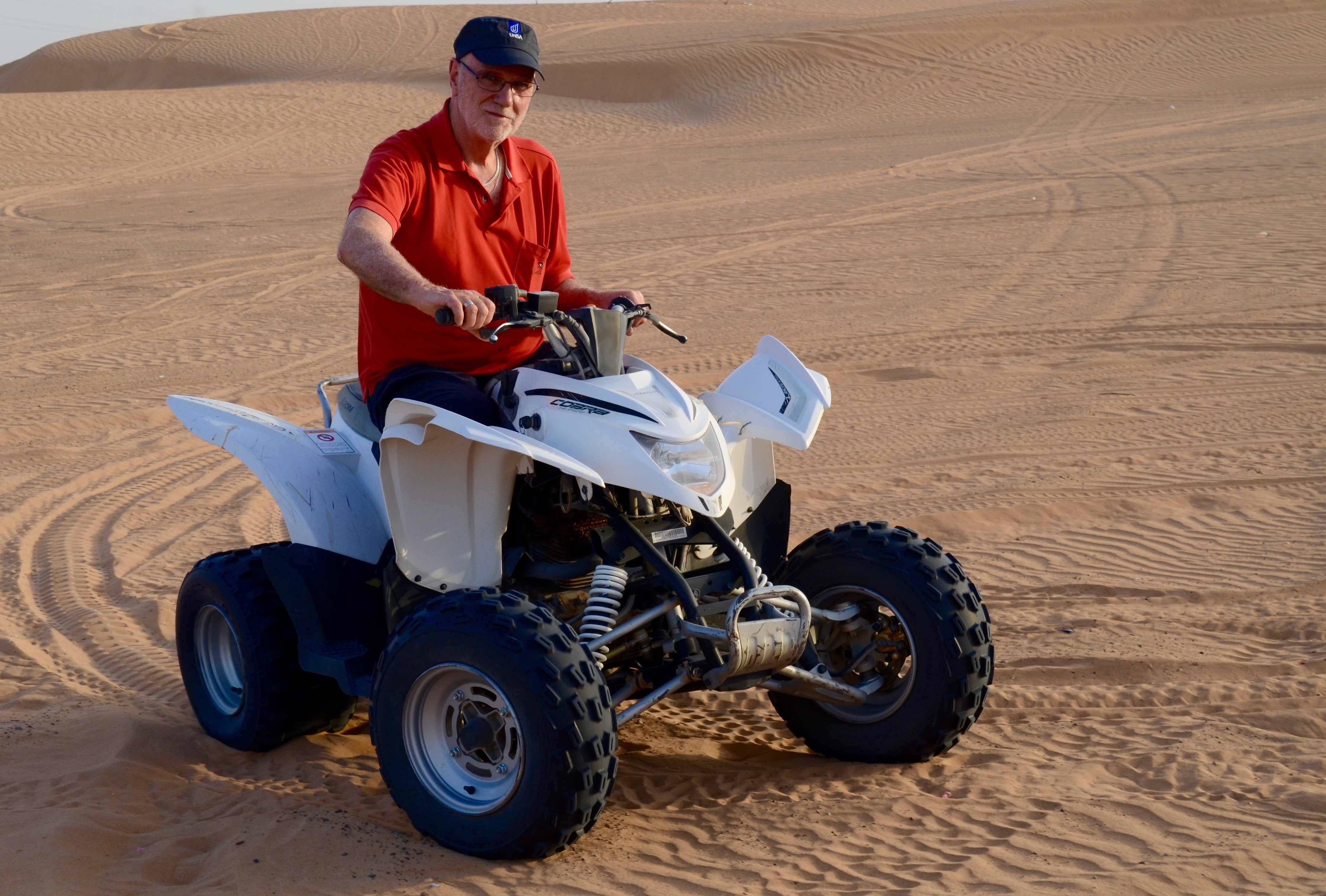 Sunday afternoon and around four o’clock I was picked up in a Toyota 4-wheel drive for a ‘desert safari’. The eight seats in the Toyota were filled, an Indian driver, one Indian (local), four Chinese and one lone Aussie. English was the common language, but the accents and speed of delivery were a challenge for all of us. However, by the trip’s end we were communicating quite well. The drive out to the sand hills was about an hour, and it was a scenic drive of sand and more sand, a brown to reddish colour. Once the tyre pressure was down to about 15 (kpa) – so we didn’t get bogged – we joined a convey of four other vehicles for a thrill. I had been 4-wheel driving previously, not on big sand hills like this, but none of the others had experienced it in their past. The screams were loud. It was a bit of fun and the mid-ride break, to walk for a while, was welcome. I had been the driver in my previous experiences so relying an someone else was an added challenge.