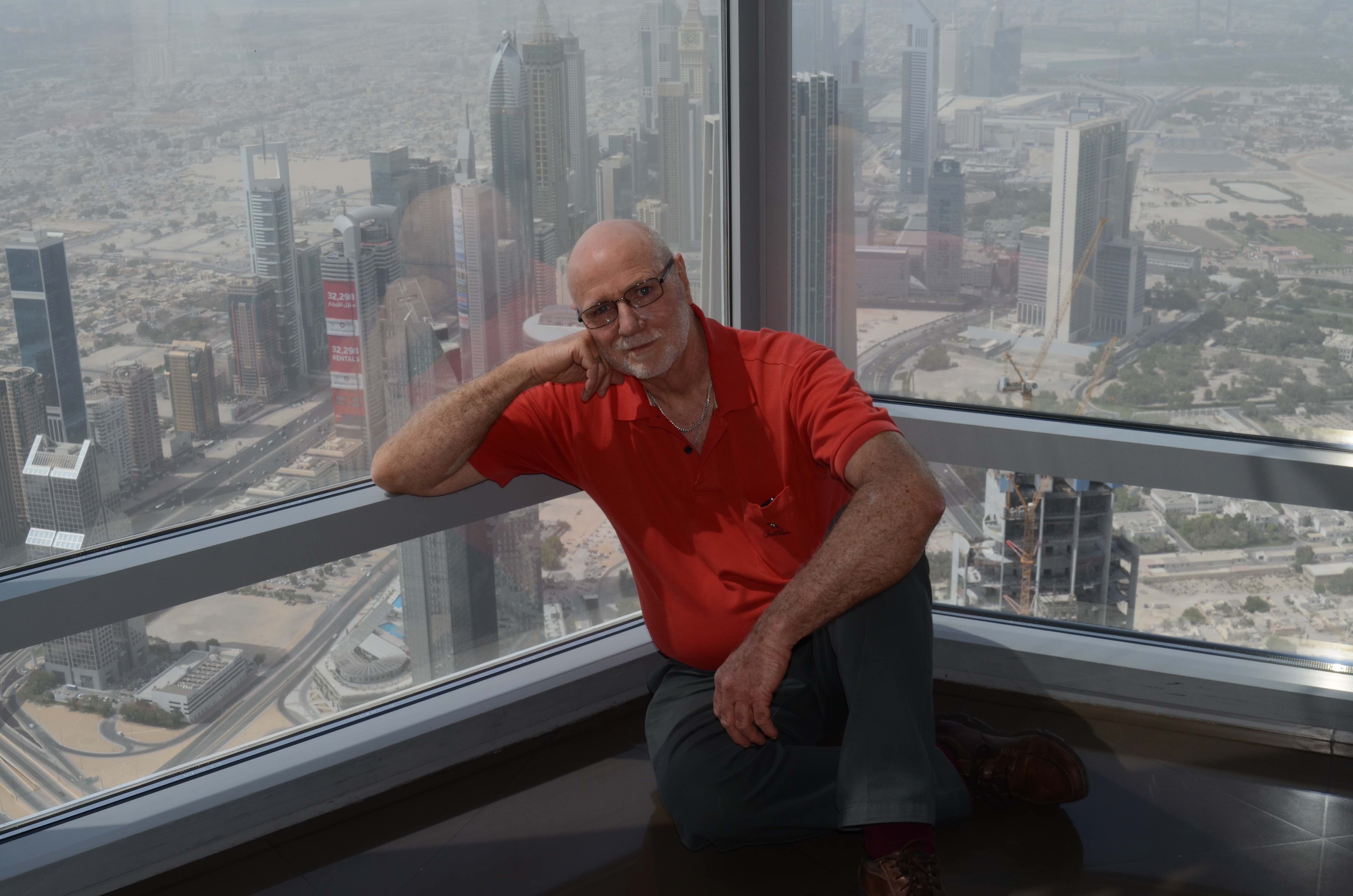Firstly I was swamped by four or five photographers – you can buy the prints when you get back to the ground floor for some rather steep prices, around A$45 for one. I graciously declined. Walking outside onto the other viewing area gave me some tingles in the fingertips. I have a healthy respect for heights and while I have abseiled and jumped from a couple of stories during my years as a firefighter, this is quite different. The ground moves. The wind stress on the building must be enormous and there is a sway you can feel. There are gaps in the safety glass surrounds where you can extend your hand an half your arm and that was a different feeling. It was hazy and there was significant sand in the air too. Yet the views were spectacular and I was surprised at how much vacant land (sand) there was – but construction is booming.
