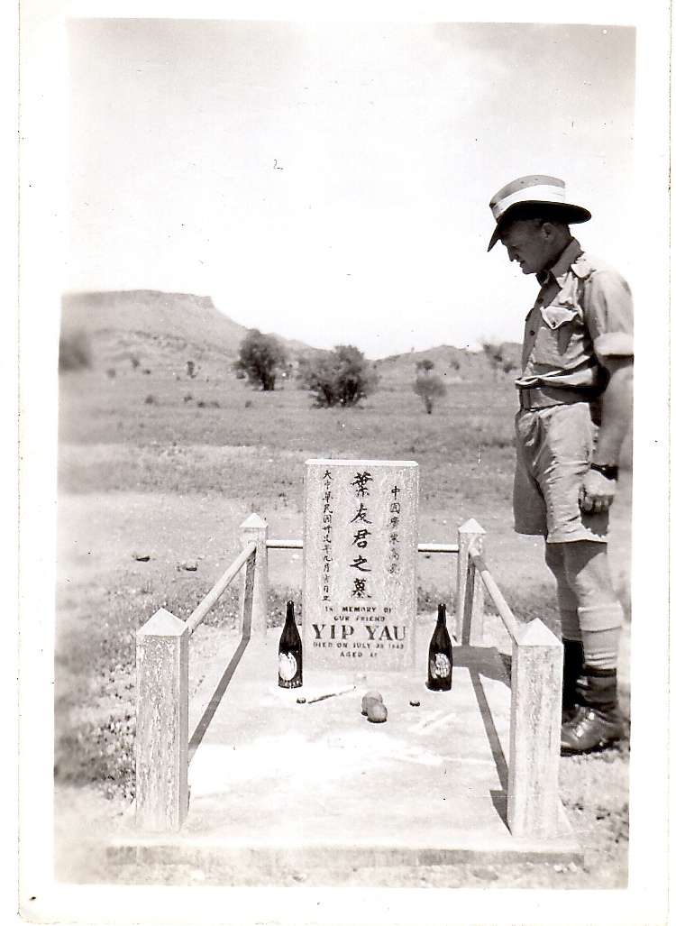 I have a photograph of my father at his grave taken in the latter half of 1943. Yip Yau was of Chinese ancestory. The English writing on his grave stone says: “In memory of good friend, Yip Yau. died July (28th?) 1943, aged 47”.